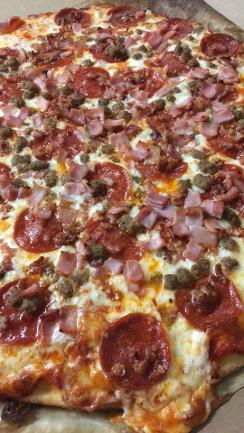 Cyle's Pizza: Pepperoni, Sausage, Bacon, Ham, Banana Peppers and Jalapenos topped with Garlic Bread Seasoning